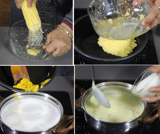 स्वीट कॉर्न भुट्टे अच्छे से धोकर इसे कद्दूकस करके उससे सारा पल्प (क्रीम) निकाल लीजिये.