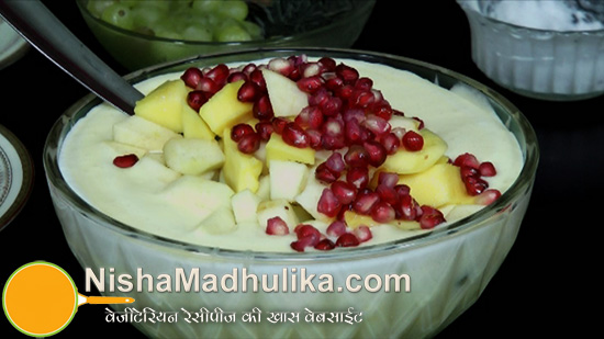 फ्रूट आम और सेब को छील कर छोटे छोटे टुकड़े में काट कर तैयार कर लीजिये, अनार को छील कर दाने निकाल लीजिये. अंगूर को डंठल से तोड़कर अलग कर लीजिये.