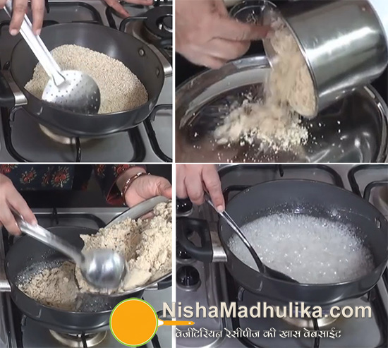 कढा़ई में 1 टेबल स्पून घी डालकर मूंगफली पाउडर को लगातार चलाते हुए 1-2 मिनिट के लिए भून लीजिए, और इसे प्याले में निकाल लीजिए.