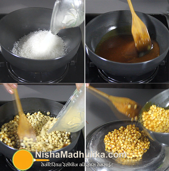 - चाशनी बनाते समय भी पूरा ध्यान रखना है, चीनी पूरी तरह पिघलने के बाद गैस तुरन्त धीमा कर दीजिये, चाशनी को ज्यादा नहीं पकाना है और तुरंत उसमें चने डाल कर मिक्स करके जल्दी से जमा देना है.