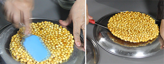 अब प्लेट के पीछे की ओर घी लगाकर चिकना कीजिये. कढ़ाई के मिश्रण को तुरन्त प्लेट पर डालकर अच्छे से फैलाइये. बेलन पर घी लगाकर चिकना कीजिये और बेलन से चिक्की को पतला बेल सकते हैं, या चमचे से दबाकर चिक्की को पतला फैला दीजिये.