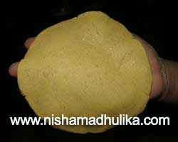 गैस पर तवा रख कर गरम कीजिये. आटे से थोड़ा सा आटा लेकर हथेली की सहायता से अच्छी तरह मसल मसल मसल कर मुलायम कीजिये, जब आटा मुलायम हो जाय तब उसमें से थोड़ा सा आटा उठा कर लोई बनाइये. लोई को हथेली से दबा कर बड़ा करक लीजिये.