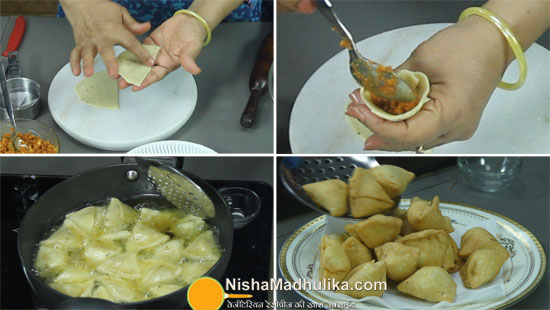 - समोसे का तिकोन बनाते समय और समोसे को बन्द करते समय, पानी की सहायता से अच्छी तरह चिपकायें.