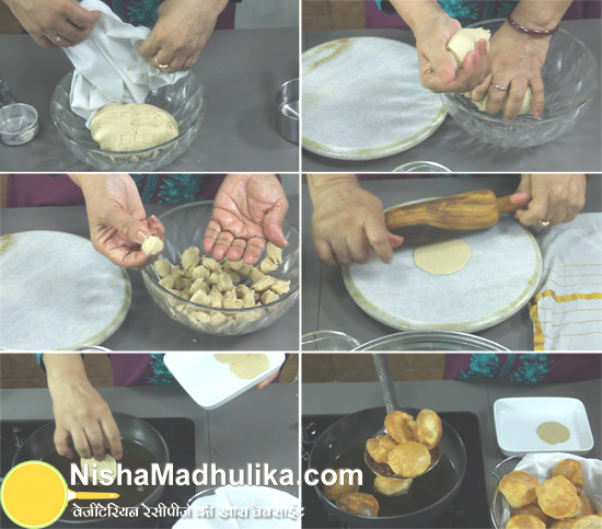 पूरियों को 15-20 मिनिट कपड़े से ढकी रहने दीजिए इसके बाद इन्हें तलें.