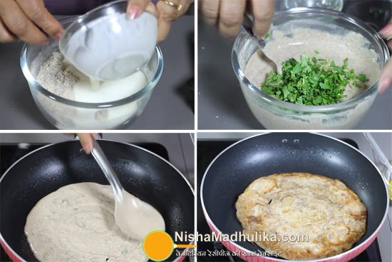किसी बड़े प्याले में रागी का आटा, गेहूं का आटा और बेसन डाल लीजिए. इसमें दही डालकर आटे को मिला लीजिए. फिर, थोड़ा-थोड़ा पानी डालकर गुठलियां समाप्त होने तक घोल लीजिए. इसके बाद, इसमें मसाले मिला लीजिए. नमक, अदरक, हरी मिर्च और थोड़ा सा हरा धनिया डालकर सही से मिला लीजिए. फिर, इसमें थोड़ा सा पानी डालकर बैटर को पतला कर लीजिए. बैटर बनकर तैयार है. बैटर चम्मच से गिराने वाली कन्सिस्टेन्सी का होना चाहिए. इस कन्सिस्टेन्सी का बैटर बनाने में ½ कप पानी और ½ कप दही का इस्तेमाल किया है. बैटर को 20 मिनिट ढककर रख दीजिए जिससे ये फूलकर तैयार हो जाए.