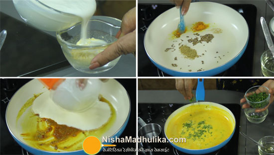 पैन में 2 छोटे चम्मच तेल डालकर गरम कीजिए. तेल गरम होने पर जीरा डालकर हल्का सा भून लीजिए. हींग डाल दीजिए और गैस धीमी रखें ताकि मसाले जले नहीं. जीरा भूनने पर हल्दी पाउडर और धनिया पाउडर डालकर मसाले को हल्का सा भून लीजिए. मसाला भून जाने पर लाल मिर्च डालकर दही-बेसन का घोल डालकर मसाले को तब तक पकाएं जब तक कि मसाले में उबाल न आ जाए.