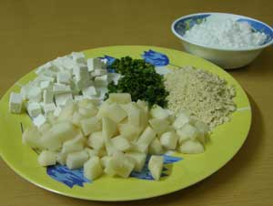 आलू को छील कर धीइये और छोटे छोटे क्यूब्स में काट लीजिये. पनीर को भी छोटे छोटे क्यूब्स में काट लीजिये.