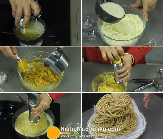 तेल गरम होने पर इसे चैक कर लीजिए. गांठिया तलने के लिए तेल मध्यम तेज गरम और आंच मध्यम चाहिए. गरम तेल में मशीन से गांठिया बनाकर डाल दीजिए. जब तेल में झाग कम हो जाएं, तब गांठिया को पलट दीजिए.