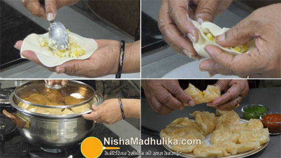 बेली हुई पूरी को हाथ पर रखिए और पूरी के ऊपर 2 छोटे चम्मच् स्टफिंग की डालकर किनारे से फोल्ड करते हुए इसे मोमोज़ का आकार देते हुए बंद कर दीजिए. इस मोमो को एक प्लेट में रख दीजिए और इसी तरह सारे मोमोज़ बना कर तैयार कर लीजिए.