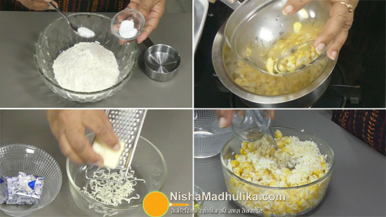 पानी में उबाल आने पर इसमें स्वीट कॉर्न के दाने डाल दीजिए. बर्तन को ढककर कॉर्न के दानों को 5 मिनिट के लिए उबलने दीजिए. इसी बीच, चीज़ को किसी प्याले में कद्दूकस कर लीजिए.