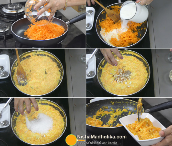 पैन में 2 टेबल स्पून घी डाल लीजिए और इसे पिघलने दीजिए. कद्दूकस की हुई गाजर को पिघले हुए घी में डाल दीजिए और मध्यम आंच पर इन्हें घी में मिक्स करते हुए 2 से 3 मिनिट भून लीजिए. 3 मिनिट बाद गाजर में 1/2 कप दूध डाल कर मिक्स कर दीजिए. अब गाजर को ढककर मध्यम आंच पर 5 मिनिट पकने दीजिए. गाजर को नरम होने तक पकाना है. गाजर को बीच में 1 बार चैक करते हुए चला दीजिए.
