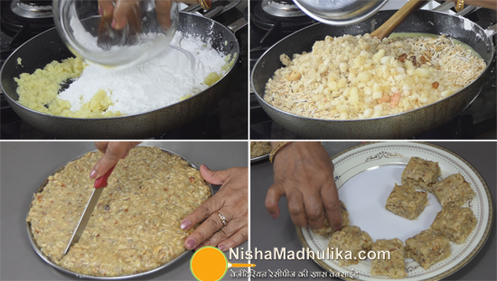 अब एक प्लेट लीजिए उसे घी लगाकर चिकना कीजिए और इस प्लेट में मिश्रण डाल कर फैला दीजिए और जमने के लिए रख दीजिए. 15-20 मिनिट बाद मिश्रण हल्का सा जम गया है और अब इस पर चाकू से काटने के निशान बना लीजिए. आप इसके टुकड़े अपने पसंदानुसार छोटे या बड़े बना सकते हैं.