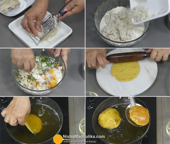 प्याले में आटा निकाल लीजिए और इसमें कद्दूकस किया हुआ केला डाल दीजिए. साथ ही इसमें बारीक कटा हरा धनिया, बारीक कटी हरी मिर्च, लल मिर्च पाउडर, हल्दी पाउडर और अजवायन डाल कर सभी को अच्छे से मिक्स कर लीजिए. अब इसमें थोड़ा-थोड़ा पानी डालते हुए पूरी के लिए सख्त आटा गूंथकर तैयार कर लीजिए. (इतनी मात्रा का आटा गुंथने में 1/2 कप पानी का उपयोग हुआ है.) आटे को ढककर 20 से 25 मिनिट के लिए रख दीजिए ताकि आटा फूलकर सैट हो जाए.