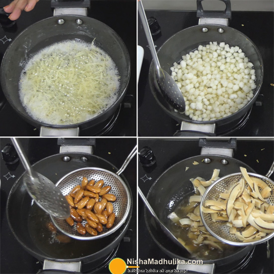 नारियल को एकदम कम गरम तेल में तलने के लिए डालें और लगातर चलाते हुए हल्का सा कलर चेंज होने तक इसे तल लीजिए. नारियल 1 मिनिट में सिक कर तैयार हैं इन्हें भी निकल लीजिए.