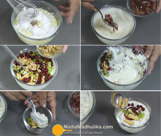 मिश्रण में बारीक कटे हुए अंगूर, सेब, कीवी, 2-3 टेबल स्पून अनार के दाने और 2-3 टेबल स्पून बारीक कटे अखरोट डाल दीजिए. सभी चीजों को अच्छे से मिक्स कर दीजिए.