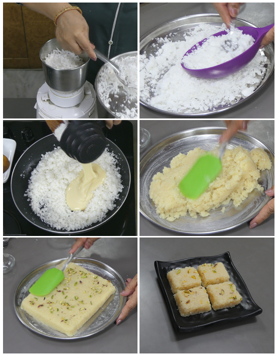 फ्रैश नारियल का पाउडर बना कर कंडेंस्ड मिल्क और अपने मनपसंद ड्राय फ्रूट डाल कर कुछ ही मिनटों में बनाएं टेस्टी नारियल बर्फी.