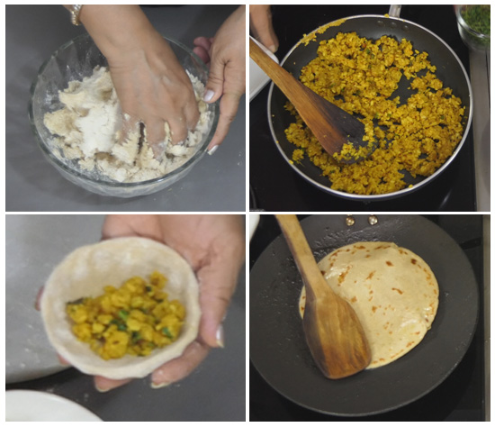 20 मिनट बाद आटे को थोड़ा-सा तेल ले कर हाथों से मसल-मसल कर सोफ़्ट कर लीजिए। अब आटे में से थोड़ा सा डो ले कर उसे गोल कर के चपटा कर लीजिए और उसे सूखे आटे में लपेट के उगंलियों की मदद से कटोरी की तरह गहराई बनाएगें और उसमें 2-3 चम्मच स्टफिंग भर कर बन्द कर देगें। अब इसे उगलियों से दबा कर सूखे आटे में लपेट लीजिए फिर हल्के हाथ से 6-7 इंच की ब्यास से बेल लीजिए। अब तवे पर थोड़ा सा तेल डाल कर चारो ओर फैला दीजिए अब तवे पर परांठा डाल दीजिए। पराठे को धीमी आंच पर सिकने दीजिए।जब तक से परांठा सिक रहा है तब तक दूसरा परांठा तैयार कर लीजिए। पराठे के एक साइड हल्की चित्ती आने के बाद उसे दूसरी साइड भी इसी तरह सेक लीजिए। अब पराठे के एक साइड पर हल्का सा तेल लगा दीजिए और उसे पलट कर दूसरी साइड भी तेल लगा दीजिए अब आंच को तेज कर के पराठे को दबाते हुए सेक लीजिए। पराठे के अच्छे से सिक जाने के बाद उसे तवे पर उसे उतार कर किसी बर्तन में रख दीजिए और इसी तरीके से बाकि आटे के भी पराठे बना लीजिए। इतने आटे में 5 से 6 पराठे बन जाएगें।