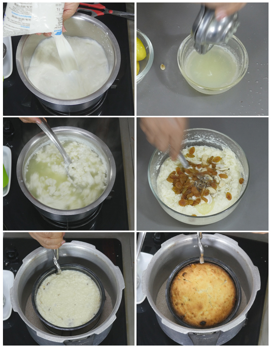 15 मिनट बाद मिश्रण में 2 बड़ी चम्मच घी, कटे हुए काजू, ¼ कप किशमिश और 4 इलायची के बीज का पाउडर डाल कर मिला लीजिए। छेना पोडा बनाने के लिए मिश्रण बन कर तैयार है। अब छेना पोडा को कुकर में बेक करने के लिए एक कुकर में ½ किलो नमक और जाली स्टैंड डाल कर ढक कर गर्म करने रख दीजिए।