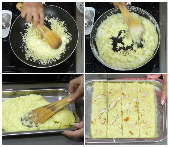 मावा को 2 मिनट तक भून लेने पर इसमें 1 कप पनीर डाल कर इसी तरह चलाते हुए भून लीजिए। मावा और पनीर के अच्छे से मिल जाने पर इसमें ¾ कप चीनी डाल कर चलाते हुए चीनी के घुलने तक भून लीजिए। चीनी के घुल जाने पर इसमें 1 कप नारियल का बुरादा और 4 इलायची पाउडर डाल कर मिलाते हुए गाढ़ा होने तक पका लीजिए।