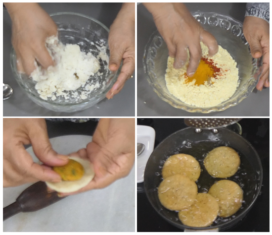 मठरी बनाने के लिए एक मैदा का टुकड़ा ले कर उसे हाथ से गोल कर के दबा-दबा कर बड़ा लीजिए अब एक बेसन का टुकड़ा ले कर मैदा की लोई के अंदर बन्द कर के बेल लीजिए। अब एक काटे वाली चम्मच ये पूरी पर निशान बना लीजिए इसी तरीके से सारी मठरी तैयार कर लीजिए।