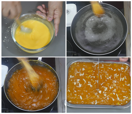 अब एक प्लेट में घी लगा कर उसे चिकना कर लीजिए। सभी चीजों के अच्छे से मिल जाने पर हलवे को चिकनी की हुई प्लेट में निकाल लीजिए। अब हलवे के ऊपर थोड़े से बादाम के टुकड़े डाल दीजिए आैर इसे 1 घंटे के लिए सेट हाने के लिए छोड़ दीजिए।