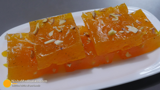 एक घंटे बाद हलवे के सैट हो जाने पर चाकू से अपने पसंदीदा आकार में काट कर एक प्लेट में निकाल लीजिए। कस्टर्ड हलवा बन कर तैयार है। इस हलवे को चलाते हुए पकाने में लगभग 30 मिनट का समय लगा है। आप इसे फ्रिज में रख कर 15 दिन तक खा सकते है।