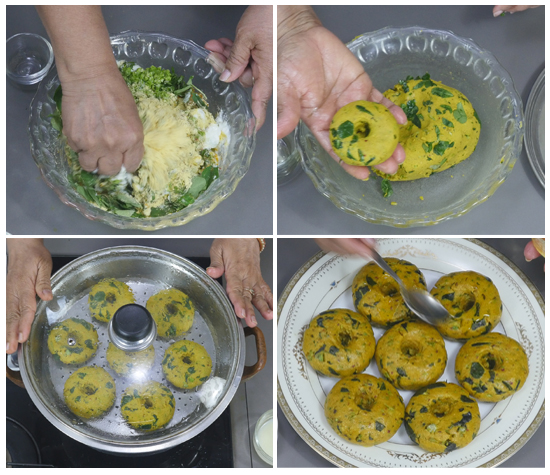 डो के तैयार हो जाने पर हाथों पर हल्का सा तेल लगा लीजिए। अब डो में से थोड़ा सा डो ले कर उसे दोनो हाथों से गोल करके चपटा कर लीजिए और बीच में से एक छेद कर दीजिए। इसी तरीके से सारे डो के ढोकले बना कर एक प्लेट में रख लीजिए।