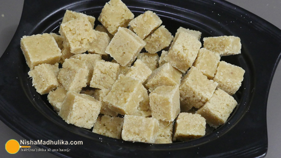 अब एक ट्रे पर बटर पेपर रख कर बटर पेपर हल्का सा घी लगा कर उसे ग्रेस कर लीजिए। मिश्रण के गाढ़ा हो जाने पर आंच को धीमा कर के मिश्रण के एक-दो बूंदे एक प्याली में डाल कर उसका गाढ़ापन चैक कर लीजिए। मिश्रण एक दम गाढ़ा हो जाने पर मिश्रण को ट्रे में डाल कर चम्मच से एकसार फैला दीजिए।