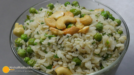 5 मिनट बाद मटर के गलने पर इसमें 1 छोटी चम्मच नमक, 1 छोटी चम्मच चीनी, 1/2 छोटी चम्मच गरम मसाला ,1/2 छोटी चम्मच काली मिर्च और चावल चुड़ा डाल कर मिलाते हुए पका लीजिए। सभी चीजों के मिला लेने पर इसमें हरा धनिया और 1 नींबू का रस और थोड़े से भुने हुए काजू डाल कर मिला लीजिए।