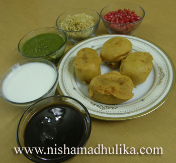 हरी चटनी बटाटा बड़ा के साथ बनाई थी, मीठी चटनी फ्रीजर में रखी थी, दही तो घर में रहता ही है, अनार दाने छीले और सेव भी निकाल लिये, इन सबको मिला कर बन गई एक लाजबाव बटाटा बड़ा चाट, तो आइये बनाते हैं बटाटा बड़ा चाट.