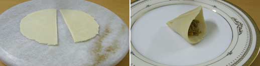पूरी को 2 बराबर भागों (अर्धचन्द्राकार आकार ) में काट लीजिये. एक हिस्सा उठाइये, दोनों कोने मिला कर कोन बनाते हुये पानी की सहायता से चिपकाइये. इस कोन में एक या डेड़ छोटी चम्मच पिठ्ठी भरिये, पिठ्ठी भरने के बाद, पीछे के किनारे में एक प्लेट डाल दीजिये, अब दोनों किनारों पर पानी लगाइये ओर हाथ से दबा कर अच्छी तरह चिपका दिजिये. समोसे का आकार सही होना चाहिये, समोसे को प्लेट में लगाइये और सारे समोसे इसी तरह बनाकर तैयार कर लीजिये. सारे समोसे तैयार हो गये हैं अब इनको तलना है.