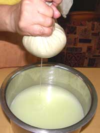 कपड़े को हाथ से दबा दबा कर अतिरिक्त पानी निकाल दीजिये. पनीर या छैना तैयार है.