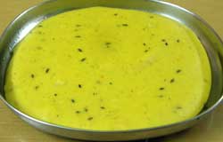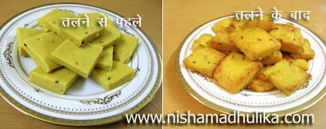 किसी चौकोर प्लेट या ट्रे में तेल लगा कर चिकना कीजिये, चिकनी प्लेट में यह घोल डाल कर फैलाइये तथा ठंडा होने रख दीजिये. लगभग 20 मिनिट में यह घोल जम कर तैयार हो जाता है.