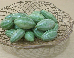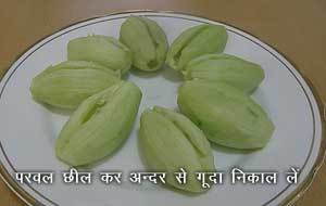 कटे हुये परवल के अन्दर से सावधानी पूर्वक इस तरह बीज निकालिये कि परवल का आकार न बिगड़े.
