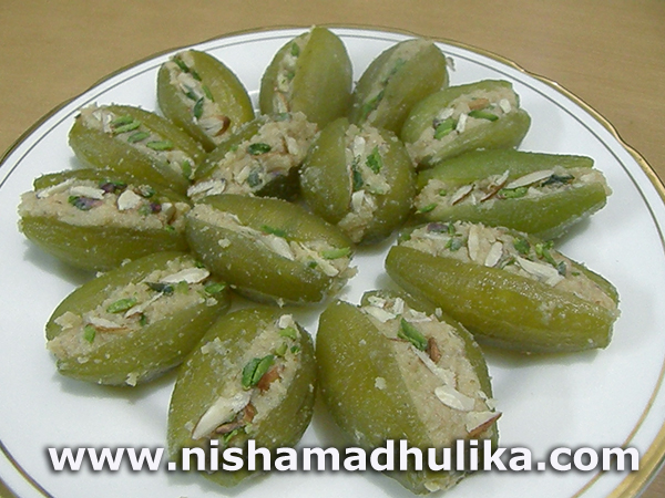 अब एक एक परवल उठाइये और पिठ्ठी परवल के अन्दर भरिये, ऊपर से कतरे हुये बादाम और पिस्ते चिपकाइये. सारे परवल में पिठ्ठी भर कर, कटे हुये मेवे लगाकर परवल को मिठाई को प्लेट में लगाइये.