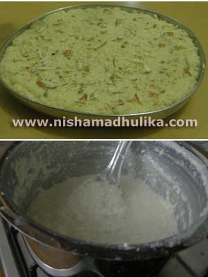 किसी प्लेट में घी लगाकर चिकना कीजिये और इस मिश्रण को इस घी लगी प्लेट में जमने के लिये रखिये. ऊपर से कतरे हुये पिस्ते और बादाम डाल कर लगा दीजिये.