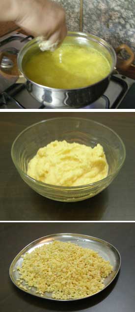 पानी में उबाल आने के बाद, हाथ से दाल उठाकर छोटी छोटी पकोड़ी बनाकर उबलते पानी में डालिये. धीरे धीरे सारी दाल से पकोड़िया तोड़ कर(बनाकर) डाल दीजिये और अब जो दाल कटोरे में लगी रह गई हैं उसमें थोड़ा सा पानी डाल कर उस पानी को भी उबल रही पकोड़ी में डाल दीजिये.