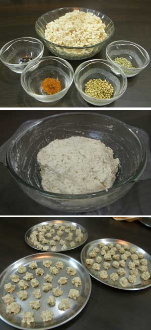 थालियों को तेल लगाकर चिकना कर लीजिये, हाथ से दाल उठाइये और आप अपने पसन्द के आकार की बड़िया बनाकर तेल लगी थालियों में रखिये, थोड़ी थोड़ी दूर पर बड़ियां तोड़ते जाइये, सारी थाली को बड़ियों से भर लीजिये.