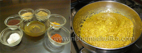 कढ़ाही में तेल डालकर गरम कीजिये. इस तेल में पिसे हुये मसाले-आम का पल्प डाल दीजिए. हल्दी पाउडर, लाल मिर्च पाउडर, नमक और हींग भी डाल दीजिए. सारी सामग्रियों को मिलाते हुए 2 से 3 मिनिट तक भून लीजिये.