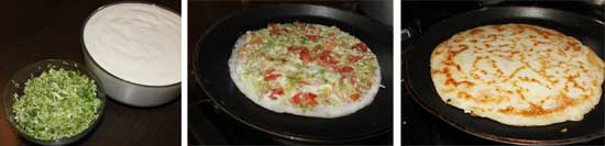 2 टेबल स्पून घोल लेकर गरम तवे पर डालिये और चमचे से गोल-गोल एक जैसा थोड़ा मोटा उत्तपम फैलाइये. उत्तपम के ऊपर थोड़ी सब्जियां लेकर एक जैसी चारों ओर करते हुये फैला दीजिये और हल्का सा इन्हें चम्मच से दबा दीजिए. थोड़ा सा तेल उत्तपम के चारों ओर और 1 छोटी चम्मच तेल उत्तपम सब्जियों के ऊपर डालिये, कलछी से सब्जियों को अच्छी तरह दबा दीजिये.
