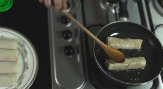 कढाई में एक टेबल स्पून तेल डालकर गरम करेंगे और 2 स्प्रिंग रोल कढ़ाई में डालेंगे और चारों ओर पलट पलट कर, हल्के ब्राउन होने तक तलेंगे, तले रोल प्लेट में निकाल कर रख लीजिये, जितने भी स्प्रिंग रोल आप सैलो फ्राई करना चाहें इसी तरह से फ्राई कर लीजिये.