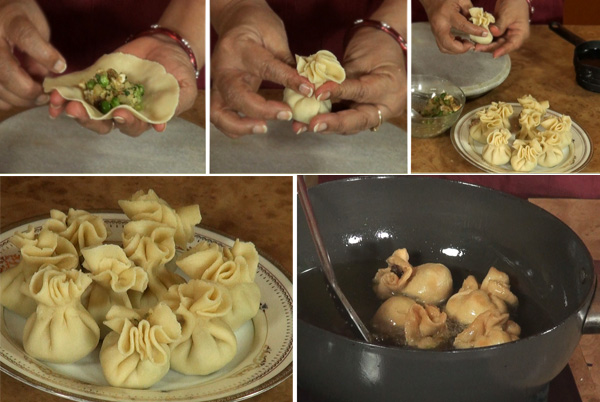 लोइयों को कपड़े से ढककर रखिये ताकि वे सूखे नहीं, एक लोई निकालिये और पतली पूरी बेलिये, पूरी को बहुत अधिक पतला नहीं करनी है. बेली हुई पूरी को दायें हाथ की हथेली पर रखिये. 1 - 1 1/2 चम्मच स्टफिंग पूरी के बीच में रखिये और ऊपर से आधा इंच छोड़ते हुये सारी गोलाई में ऊंगली से पानी लगाइये, पूरी को दूसरे हाथ से उठाकर स्टफिंग को पोटली के आकार में बन्द कीजिये, और अब दूसरे हाथ की उंगलियों और अंगूठे की मदद से से पोटली को स्टफिंग के ऊपर और बाहरी हिस्से से आधा इंच छोड़ते हुये दबाकर चिपका दीजिये. सारे पोटली समोसे इसी तरह तैयार कर लीजिये.