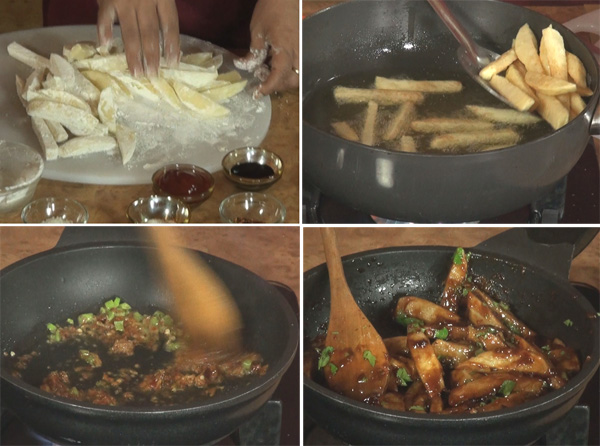 कार्न फ्लोर कोटेड आलू को तलने के लिये कढ़ाई में तेल डालकर गरम कीजिये. तेल गरम होने पर कार्न फ्लोर कोटेड आलू डालिये और गोल्डन ब्राउन होने तक तल कर निकाल किसी स्टील की छलनी में निकाल लीजिये, सारे आलू के टुकड़े तल कर तैयार कर, छलनी में रख लीजिये, ताकि अतिरिक्त तेल स्टेनर से नीचे बर्तन में चला जाय.