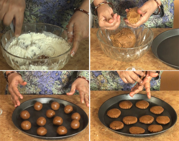 बेकिंग ट्रे में थोड़ा मक्खन लगाकर चिकना कर लीजिये. मिश्रण को 12 बराबर के टुकड़ों में तोड़ लीजिये, एक तोड़ा हुआ मिश्रण उठाइये और गोल कर लीजिये, सारे गोले बनाकर ट्रे में लगा लीजिये, अब एक गोला उठाइये और हथेली पर रखकर चपटा कुकीज का आकार दीजिये और वापस ट्रे में लगा लीजिये, सारे गोले चपटे करके ट्रे में थोड़ी दूर दूर पर लगा दीजिये.