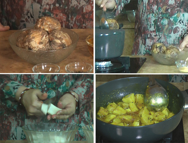 कढ़ाई में सरसों का तेल डालकर, अच्छा गरम कर लीजिये (तेल को अच्छा गरम करने से तेल का तीखा पन दूर हो जाता है), गैस बन्द करके तेल को थोड़ा ठंडा होने दीजिये, अब धीमी गैस करके हल्के गरम तेल में अजवायन, कलोंजी, मेथी के दाने डालकर हल्का सा भून लीजिये. कचालू के टुकड़े, हींग, हल्दी पाउदर, लाल मिर्च पाउदर, सरसों पाउडर और नमक डाल कर सारी चीजों को मिक्स करके, चमचे से चलाते हुये 2 मिनिट तक पकाइये. गैस बन्द कर दीजिये.