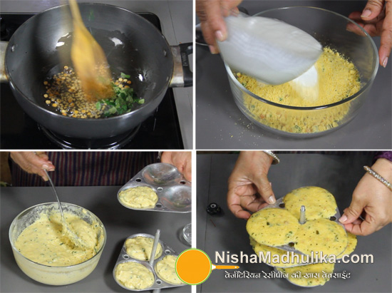 कुकर में 2-3 कप पानी डालकर गरम होने रख दीजिये. इडली स्टेन्ड के खांचों में तेल लगाकर चिकना कर लीजिये. मिश्रण फूल कर तैयार हो गया है, सारी तैयारी के बाद मिश्रण में इनो फ्रूट साल्ट डाल कर, चमचे से चलाते हुये मिक्स कर लीजिये. खाचों में थोड़ा थोड़ा मिश्रण डाल कर स्टेन्ड में लगा लीजिये.