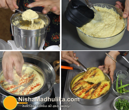 उरद की दाल को बारीक पीस लीजिये, भीगे हुये पोहा इसी में डालकर बारीक पीस दीजिये. पिसे उरद दाल और पोहे का मिश्रण चना दाल के प्याले में ही निकाल लीजिये, और सभी को मिक्स कर दीजिये. दाल के मिश्रण में अदरक, हींग, हल्दी पाउडर, हरी मिर्च, नमक और आधी लाल मिर्च डाल कर अच्छी तरह मिक्स कर लीजिये, मिश्रण में 2 छोटे चम्मच तेल भी डालकर मिक्स कर दीजिये (बैटर की कनसिसटेन्सी ढोकला के बैटर की कनसिसटेन्सी जैसी ही रखिये). मिश्रण अगर गाड़ा लग रहा हो तो 2-3 टेबल स्पून पानी डालकर मिलाया जा सकता है.