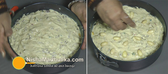 केक बेक करने के लिये 8- 9 इंच डायमीटर का कन्टेनर ले लीजिये. कन्टेनर में गोल बटर पेपर काट कर बिछा लीजिये, इसके ऊपर और कन्टेनर के किनारों पर बटर लगाकर चिकना कर लीजिये. मिश्रण को कन्टेनर में डालिये और एक जैसा फैला दीजिये, ऊपर से बादाम लगा दीजिये. ओवन प्रीहीट हो कर तैयार है. कन्टेनर को जाली स्टेन्ड पर रख दीजिये और केक को 180 डि. से. पर 35 मिनिट के लिये बेक कीजिये. केक को चैक कीजिये, केक हल्का ब्राउन है, केक को 10 मिनिट और बेक होने दीजिये, केक को चैक कीजिये केक अभी भी हल्का ब्राउन दिख रहा है केक को 170 डि.से. पर सैट करके 10-15 मिनिट केक को ऊपर से गोल्डन ब्राउन होने तक बेक कर लीजिये.