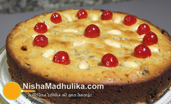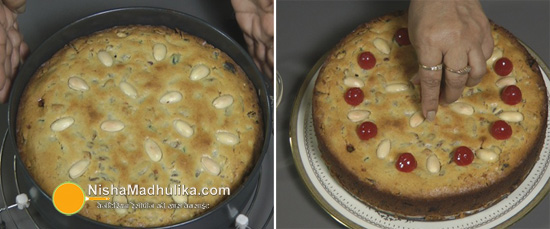 केक बेक हो गया केक को ओवन से बाहर निकाल कर 10 मिनिट तक ठंडा होने दीजिये और इसके बाद कन्टेनर के किनारे से चाकू की सहायता से अलग कर लीजिये और केक को बाहर निकाल लीजिये, केक के ऊपर ग्लेज्ड चैरी काट कर लगा दीजिये. बहुत ही अच्छा क्रिसमस केक बनकर तैयार है. केक को ठंडा होने के बाद सर्व कीजिये, और बचे हुये केक को कन्टेनर में भर कर रख लीजिये. क्रिसमस केक को फ्रिज में रखकर 1 माह तक खाया जा सकता है.