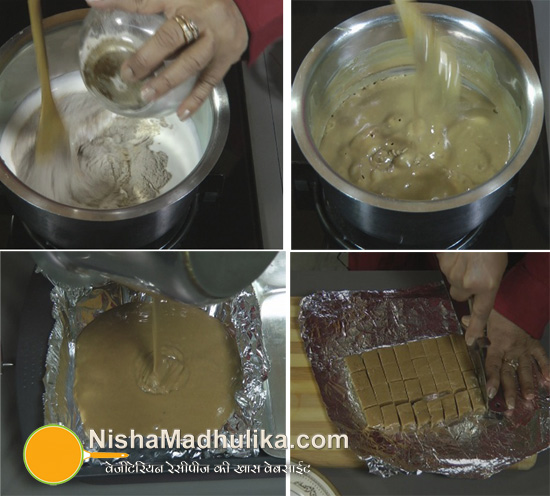 अगर आपके पास केन्डी थर्मामीटर है तब आप थर्मामीटर उबलते मिश्रण में डालिये और 250 डि.फारेनहाइट या 120 डि. सेल्सियस. तक मिश्रण को पका लीजिये और सैट रख दीजिये.